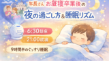 20:30〜21:00に寝て、6:30〜7:00に起きるリズムが一般的な目安のようです。