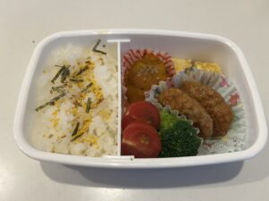 前日がハンバーグだったので小さめサイズも一緒に作って、お弁当にイン。