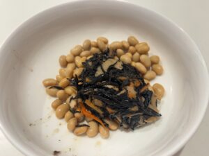 ①お皿に蒸し大豆とひじきのお惣菜を入れる