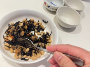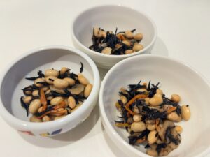 子どもの分は蒸し大豆多めにし、ひじきは少なめで味の濃さを薄めに調節します。